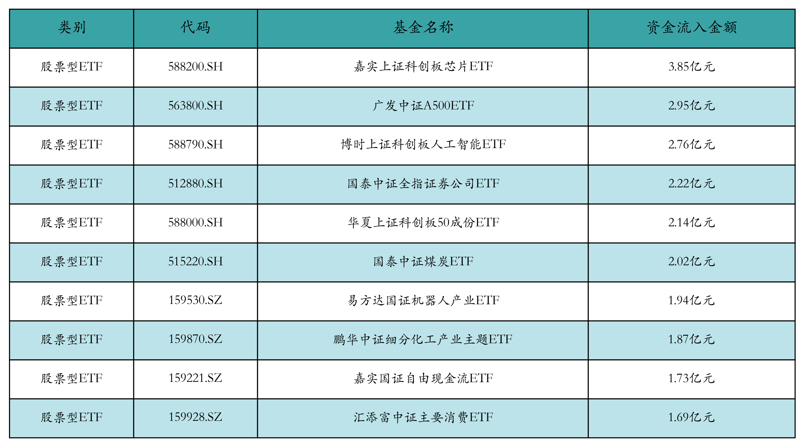 昨日股票型ETF资金流入最多的3只ETF及其流入金额分别为:嘉实上证科创板芯片ETF(流入3.85亿元)、广发中证A500ETF(流入2.95亿元)、博时上证科创板人工智能ETF(流入2.76亿元)。资金流入前10详情见下表: