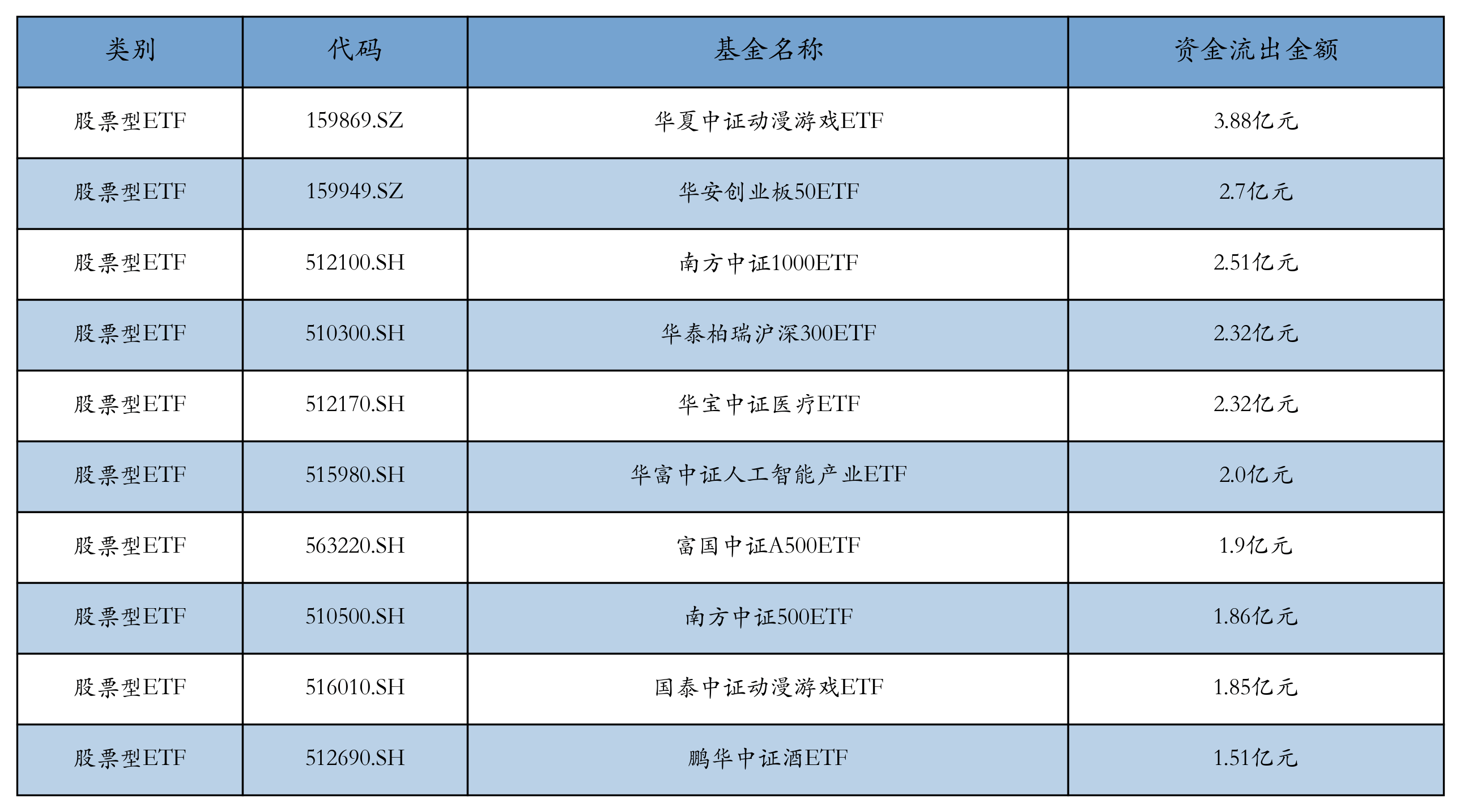 昨日股票型ETF资金流出最多的3只ETF及其流出金额分别为:华夏中证动漫游戏ETF(流出3.88亿元)、华安创业板50ETF(流出2.7亿元)、南方中证1000ETF(流出2.51亿元)。资金流出前10详情见下表: