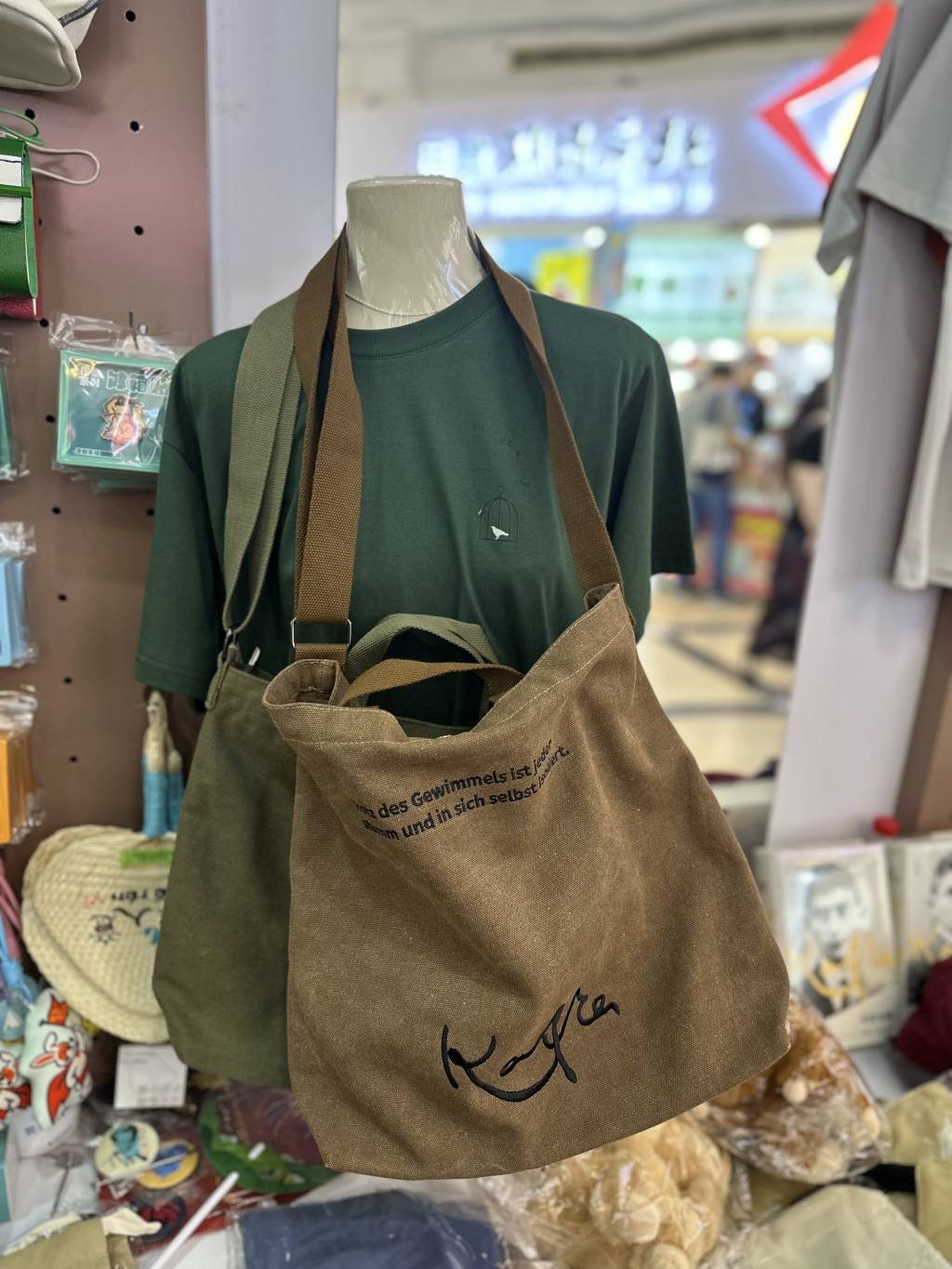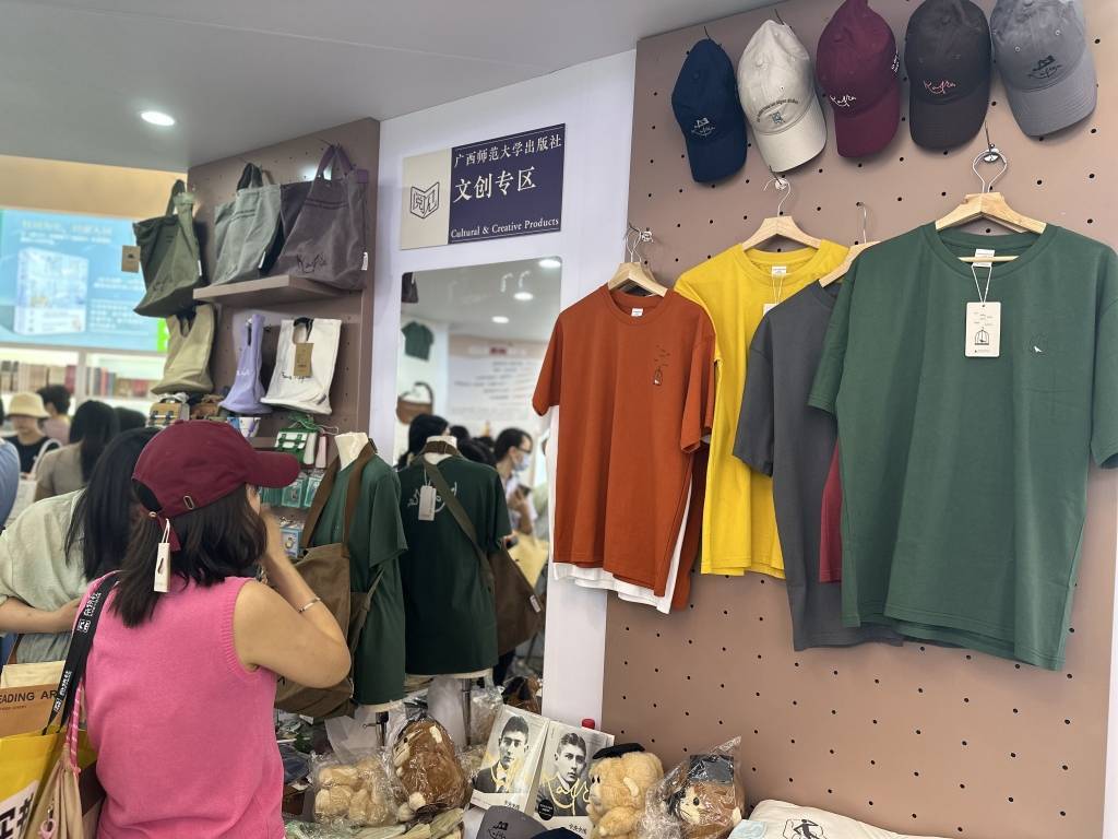 书展现场的直播卖书也成为了常态。在很多展位旁边都有主播直播带货,他们没有专设的玻璃房间,也不在乎身边的人声鼎沸。反而是在他们身后穿梭的人群和嘈杂的声音将书展的热闹气氛传递给屏幕那一头的读者。这种现象已经持续了几年,大家也见怪不怪了。不过看到广西师范大学出版社的主播身后有一整面墙的文创产品,并且/居然还搬来了一面试衣镜和塑料模特,我还是被震撼到了,差点以为自己身处服装店。