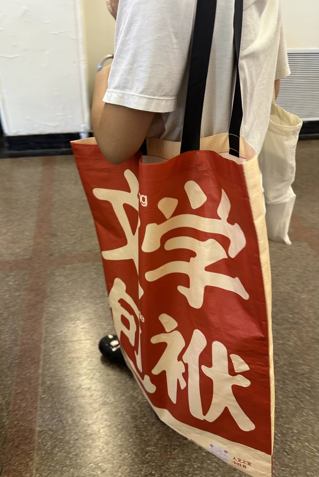 今年出版社满赠的购物袋也有变成超大号的了,读客送的购物袋似乎也比去年大很多。人民文学出版社的“文学包袱”“思想包袱”的巨型购书袋看起来很夸张,他们可能希望前来的读者尽量多买一些书,先为他们解决了装书的后顾之忧。