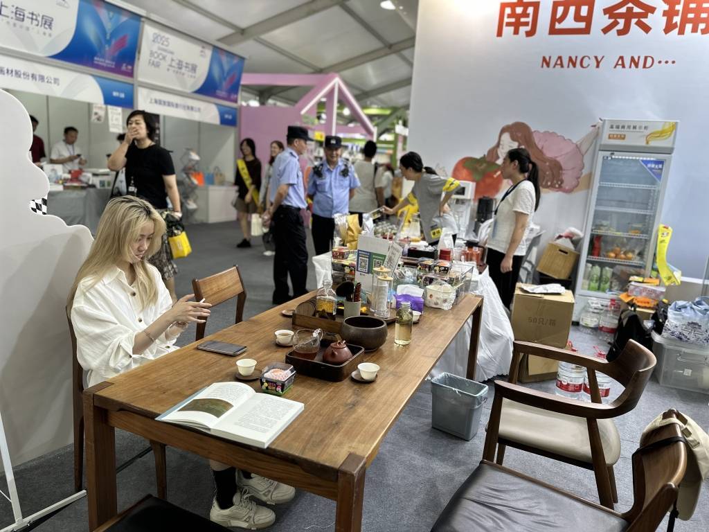 比如上海展览中心广场上专门设立的“阅界夜市”,可以让散场后意犹未尽的读者继续消费。美加净、上海制皂厂、雷允上药业等上海本地的日用医药企业也来到了上海书展,可以看出上海书展越来越多元化。浦东美术馆今年也是第一次来到上海书展卖文创,人气也很旺。甚至在展馆中还能看到一张几乎两米长的实木桌,上面摆放着茶具和图书。能够坐下来喝茶读书,估计是每位读者都梦寐以求的书展体验吧。