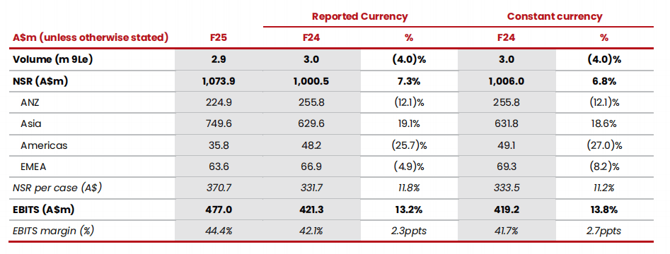 2025财年,奔富亚洲市场实现净销售额7.50亿澳元(折合人民币约35亿元),同比增长19.1%,约占奔富全球总销售额的69.8%。