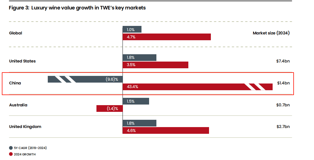 财报显示,尽管过去五年富邑集团奢华葡萄酒在中国市场的年均复合增长率为-9.6%,但随着奔富全面重返中国,2024年增长率已达到43.4%,增速远超全球其他市场。