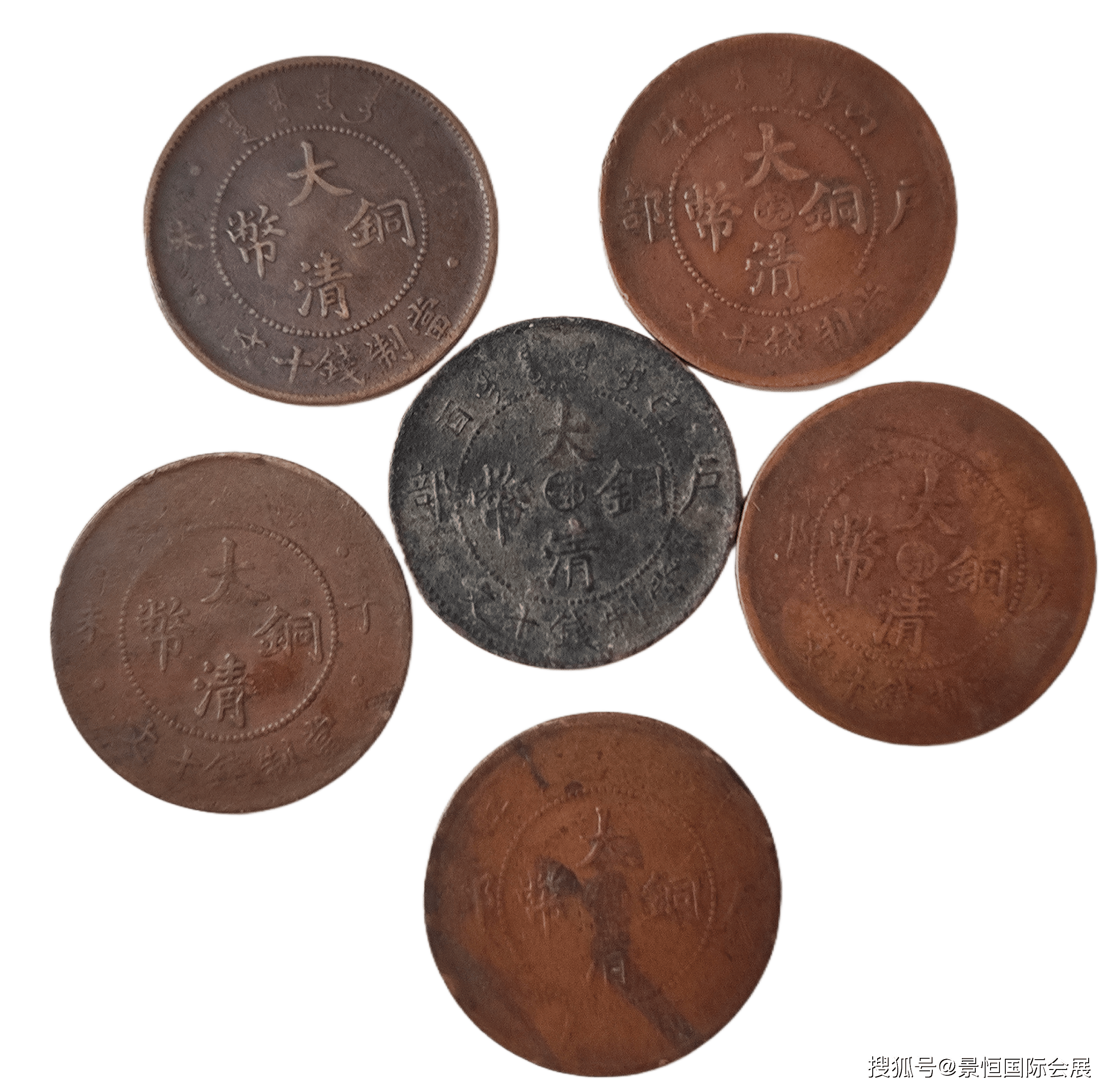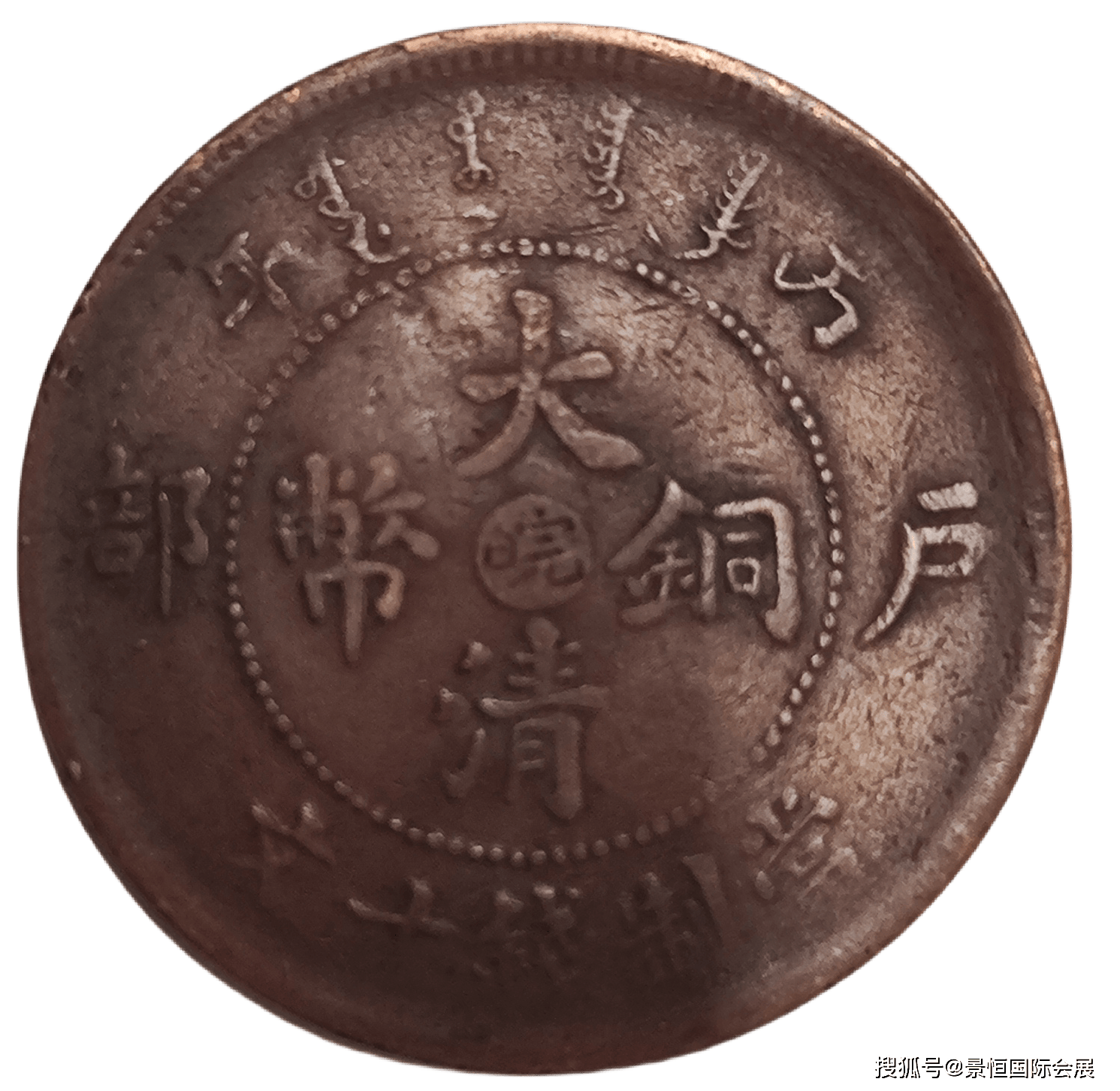 大清铜币(学名清代机制铜圆)是清政府试图将铸币权收归国有、加强控制而铸造的钱币。其铸造始于1900年(清光绪二十六年),止于1911年(宣统三年),流通时间较短。这一时期铜元的显著特点,正面均钤有汉文“大清铜币”字样,左右边缘分列“户部”和干支纪年文字,后期去掉“户部”,仅留干支纪年文字,上缘列满文“大清铜币”,下缘列纪值文字; 背面为统一蟠龙,又称“部颁龙”或“大清龙”, 上缘前期为“光绪年造”、后期为“宣统年造”字样,下缘为英文“TAI—CIIING—TI—KUO COPPER COIN”, 汉译为“大清帝国铜币”。户部所铸铜元正面中央无文字,各省所铸铜元正面中央铸一阴文单省名,也有个别为阳文以示区别。其版面设计优雅,雕刻精良,且存世量极为稀少,大清铜币光绪年户部造“当十”被誉为中国近代制币中的十大名誉品之一。