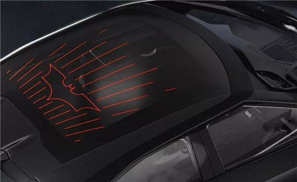 此外, 设计师在轮毂盖、后保险杠、车窗、后车门、后挡风玻璃都加入了蝙蝠标志,车顶玻璃上还有发光的《黑暗骑士三部曲》蝙蝠标志。