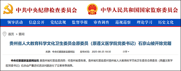 中央纪委国家监委网站8月25日发布援引贵州省纪委监委消息:经贵州省委批准,贵州省纪委监委对贵州省人大教育科学文化卫生委员会原委员(原遵义医学院党委书记)石京山严重违纪违法问题进行了立案审查调查。