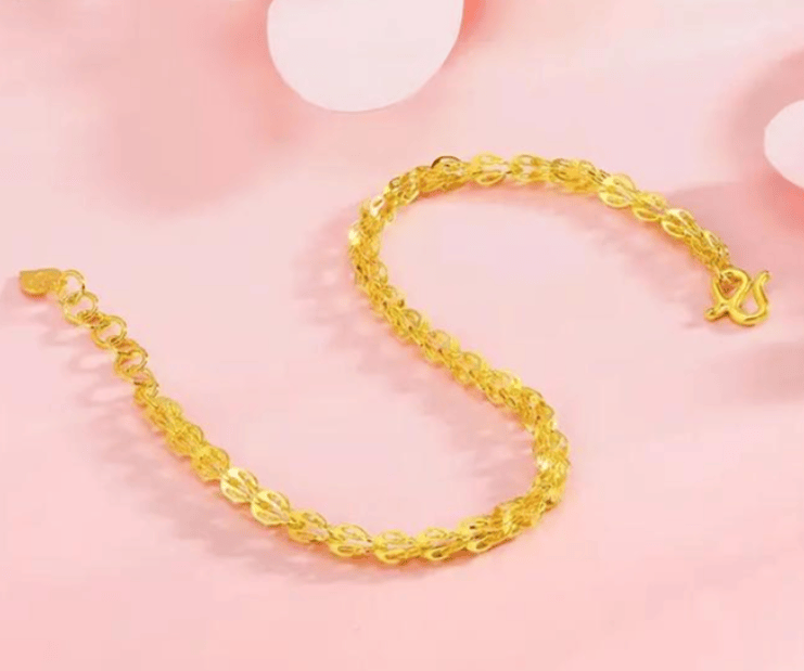 这款戒指以雏菊花朵为灵感,采用镂空雕刻工艺,让黄金显得更加轻盈灵动。花蕊部分点缀一颗小钻石或珐琅彩,增添几分精致感。戒指宽度适中,不会过于夸张,适合日常佩戴。