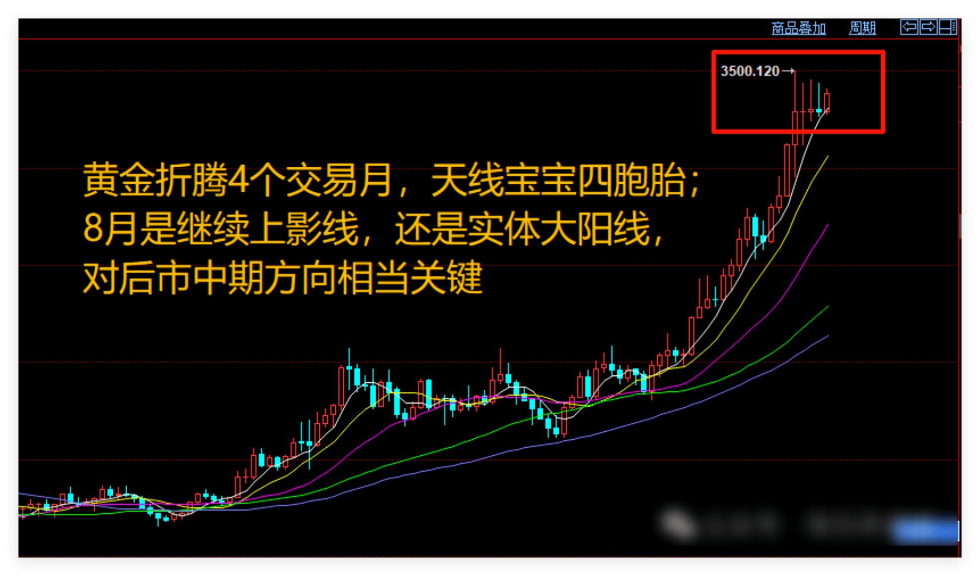 就技术面而言,黄金8月月线如果继续上影线,那就是这两天需要暴跌比如3350破位,收盘3330一带或下方,越靠近3300大关信号越强烈,这样的话就是4根天线宝宝后又来一根,后市强烈看空,3270--3245大概率破然后跌向3150-3120及3000大关!