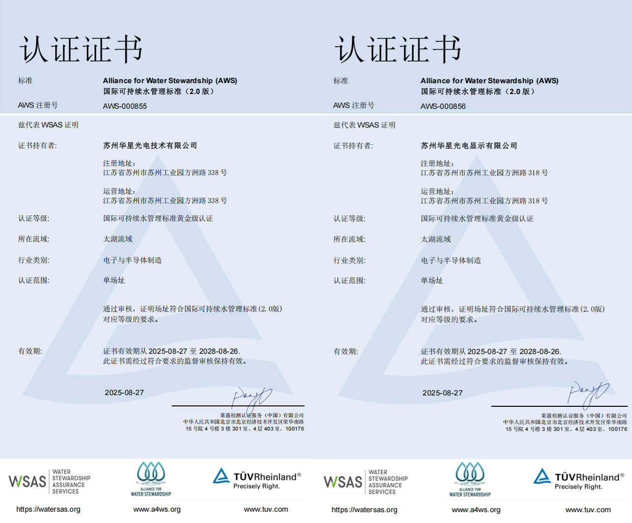 2025年8月27日,TCL华星苏州基地正式斩获AWS(Alliance for Water Stewardship,国际可持续水管理联盟)国际可持续水管理标准黄金级认证,成为中国半导体显示产业首家获此顶级殊荣的企业。