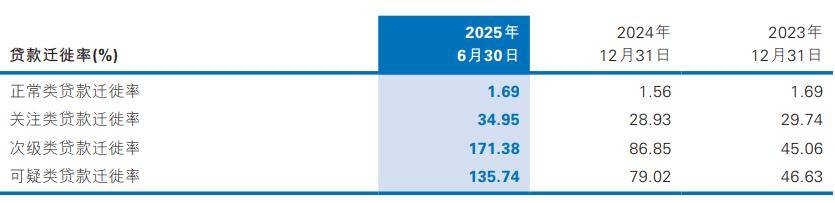 而且再看迁徙率,似乎也表现出同样的迹象,正常类的贷款由1.56%升至1.69%,而关注类、次级类迁徙率呈现飙升的状态。