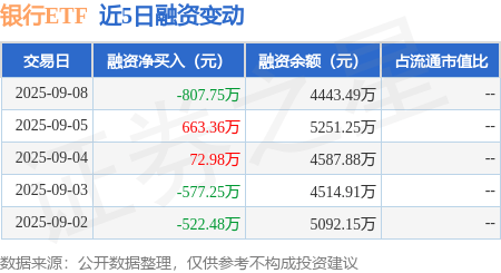 证券之星消息,9月8日,银行ETF(159887)融资买入1345.6万元,融资偿还2153.35万元,融资净卖出807.75万元,融资余额4443.49万元。