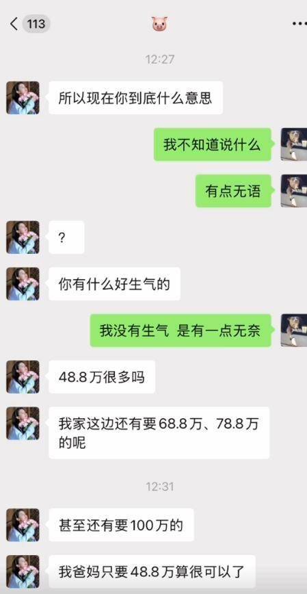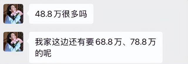 于是女友便在微信上询问他到底是怎么想的,甚至还说出了让人啼笑皆非的话,女方声称:“48.8万很多吗?”