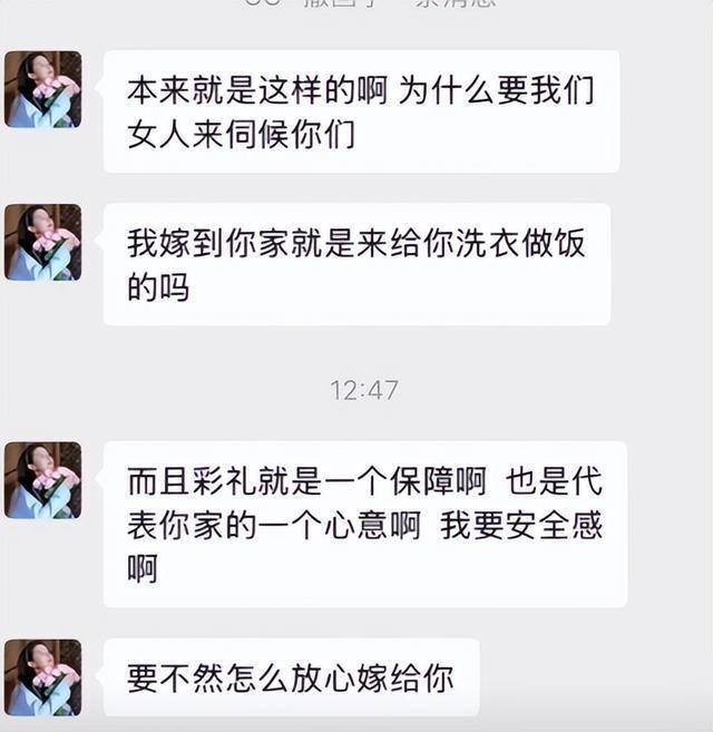 在聊天记录中,女孩明明说彩礼是为了给她生活有保障,本以为这份彩礼是女孩自己要拿着的,谁曾想却是要全部给父母,让父母拿给她的弟弟用,简直不要太离谱。