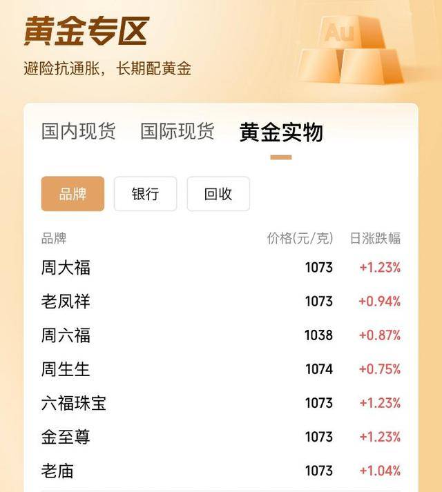 老凤祥、周大福、周大生、潮宏基、周六福、六福珠宝足金饰品价格涨至1073元/克,中国黄金今日金价1070元/克。