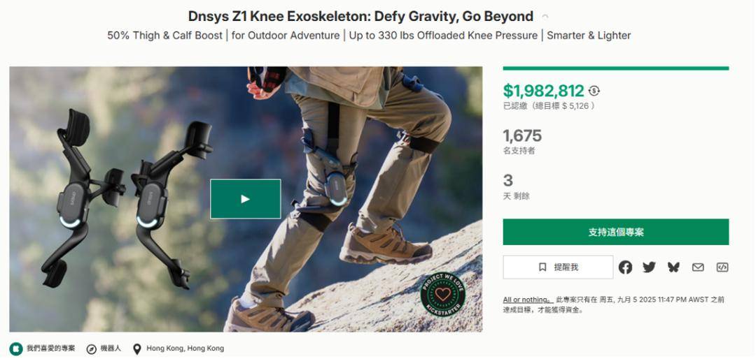 而在现实中,大众人群也开始拥有自己的“战甲”。近半年,3 款外骨骼产品上线 Kickstarter,众筹成绩均突破百万美元。其中众筹金额最高的 Dnsys Z1,已筹得近 200 万美元,也是 3 款产品中最新的一款。