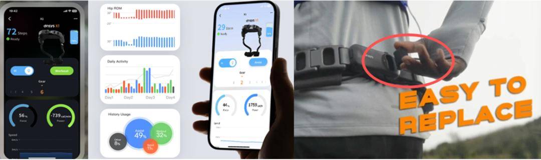 软件方面,通过 Dnsys 的官方 App,用户可以监控、调整设备的运行状态,记录用户历史运动数据(如髋关节活动度、步频等)。此外,X1 提供 3-7 小时的电池续航(X1 提供 Lite 和 Carbon 两个版本),搭配其动能回收系统,可在电量将尽时额外提供约 25 公里的续航;支持 USB 快充和小巧的外接电池替换。
