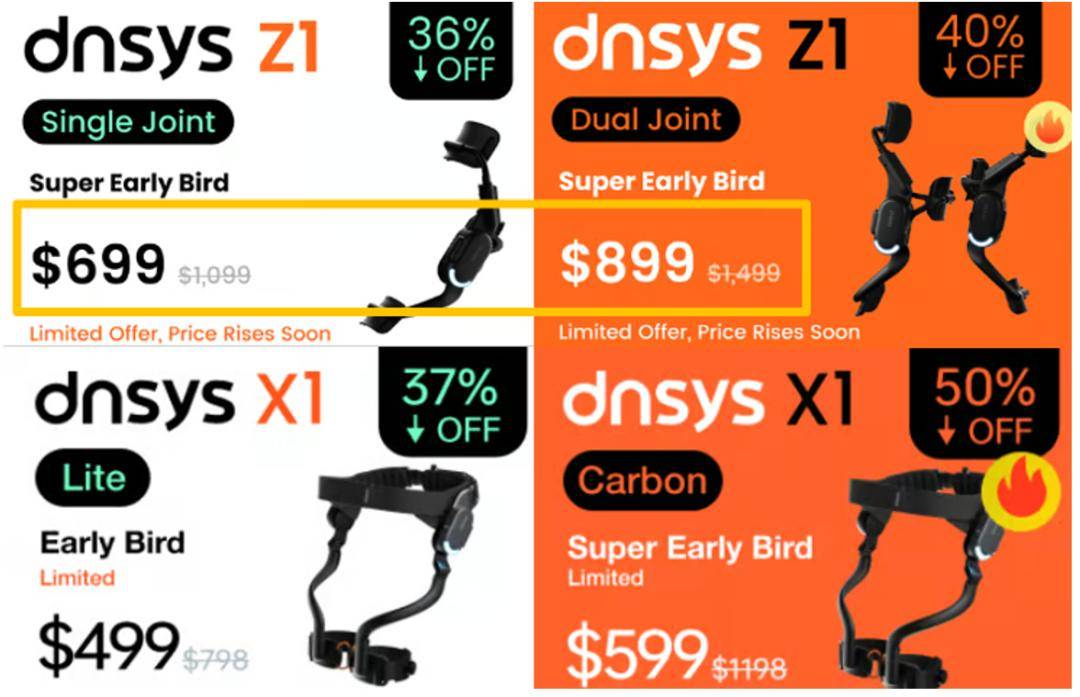 考虑到大部分人双腿受力不均的情况,Dnsys 在 Z1 的售卖策略上也有所调整。X1 均做整体售卖;而 Z1 支持单边出售,早鸟价 699 美元一只,一副 899 美元。整体价格较 Z1 贵了 200-300 美元。但就其目前 1600 余名支持者、近 200 万美元且还在增长的众筹成绩来看,海外有大量可以接受高单价、高科技的户外运动爱好者,其中应该也不乏将其用作日常出行辅助器的购买者。