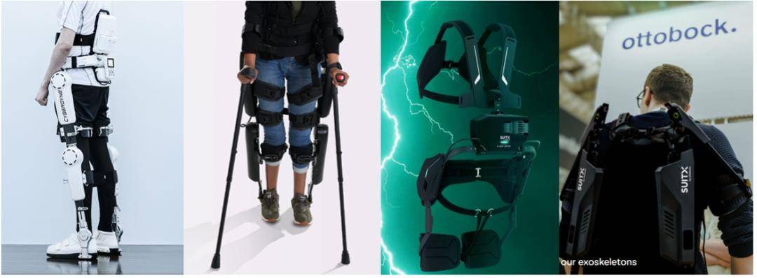 外骨骼产品在医疗(左)和工业领域(右)的产品|图源CyberDyne、Rewalk和Suitx官网