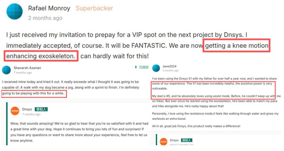 X1购买者相关评论;还有用户表示可以用X1辅助遛狗或减轻家里老人的行动负担|图源Kickstarter