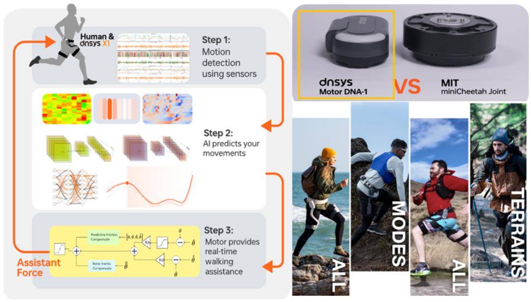 X1 能够适应不同用户运动习惯的关键,在于其 AI 辅助系统。其内置的传感器检测到使用者的动作后,会通过 DNNAS(动态神经网络辅助系统)学习用户运动习惯,然后 AI 系统将预测下一步行动意图,相应计算出电机的扭矩命令。