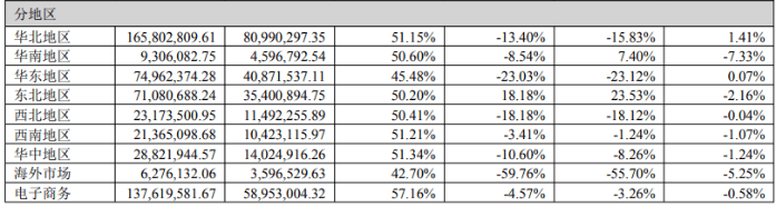 今年上半年,亚冬会的举办带动了东北地区对户外装备的刚性需求,报告期内,探路者来自东北地区的收入同比大幅增长18.18%,而来自华北、华东、华南等国内六大地区以及海外市场和电商的收入均呈现不同程度的下滑;电商渠道和海外市场收入分别同比下滑4.57%和59.76%。