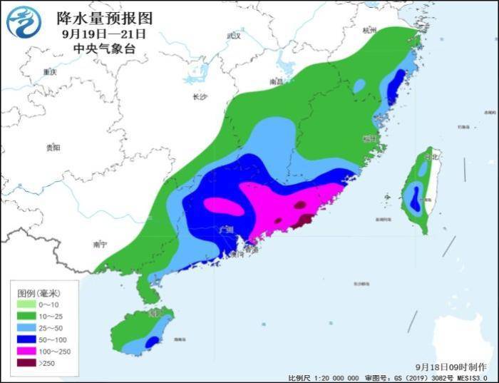 降雨预报:预计19日至21日,广东、福建南部、江西南部、湖南东南部、广西东部、海南岛东部和南部等地有大到暴雨,广东中东部、福建东南部的部分地区有大暴雨,局地有特大暴雨。上述部分地区累计降雨量120~200毫米,广东东部沿海局地可达250~400毫米;最大小时降雨量40~60毫米,局地超80毫米。主要降雨时段在19日白天至20日夜间。