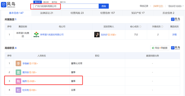 比如广州六和饲料有限公司,这是新希望六和股份有限公司旗下的公司。陶煦原来是担任法定代表人,在2023年11月才退出,但至今担任董事职位。另外,陶煦还在武汉六和食品有限公司担任董事,这也是刘永好旗下的一家公司。