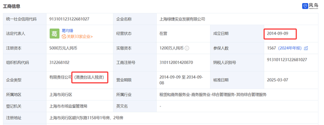 在风鸟企业查询平台可以看到,上海绿捷实业有限公司成立于2014年,是一家港澳台独资企业,法人葛均锋,最终受益人、董事长陶煦。
