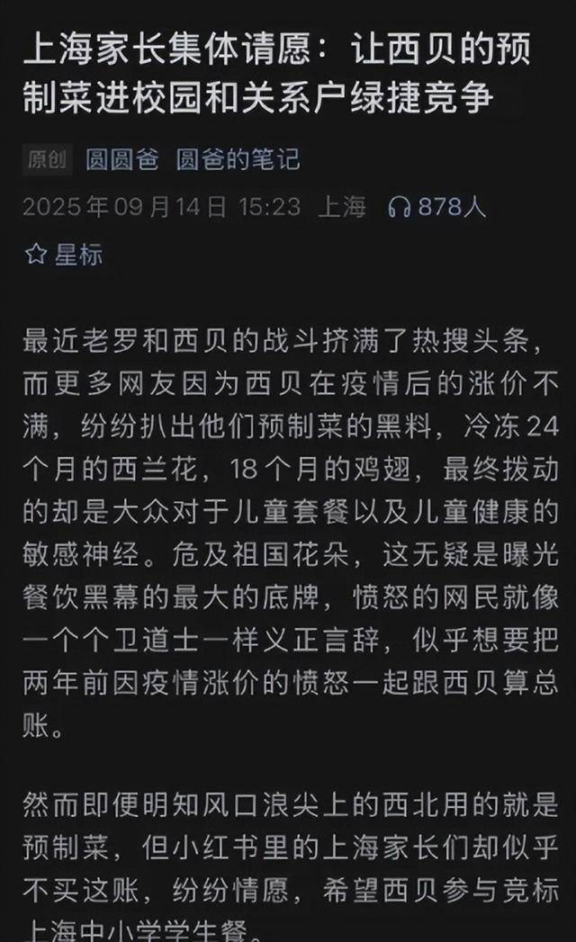 有意思的是这样的学生餐,早就引发了很多家长的不满,但是没啥用。直到最近一位家长发了一篇文章,标题是《上海家长集体请愿:让西贝的预制菜进校园和关系户绿捷竞争》,这篇文章引爆了网络,才受到关注。