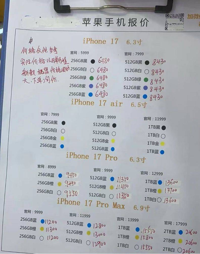 9月19日上午,华强北档口iPhone 17系列的报价单。 受访者供图。