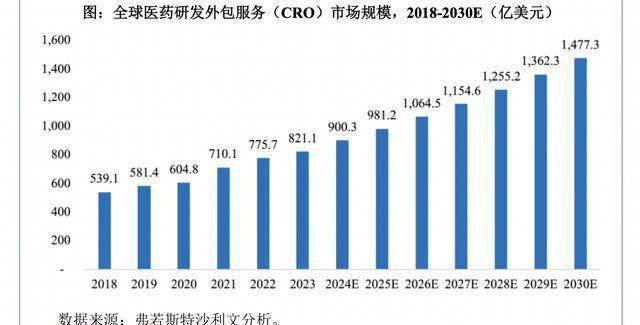 全球CRO市场规模呈现出持续增长态势,并由2018年的539.1亿美元增长到2023年的821.1亿美元,年复合增长率为8.8%。根据Frost&Sullivan的统计和预测,全球CRO服务市场规模将持续扩大,2026年达到1,065亿美元,2023年至2026年的复合年增长率为9.0%,并在2030年超过1,477亿美元。