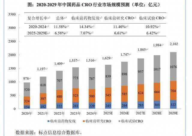 近年来,中国CRO行业快速发展,根据标点信息数据,2024年中国药物外包服务行业市场规模已达到1,516亿元人民币,2020年至2024年的年均增速达到11.58%。医药研发投入不断增长,新型疗法兴起,加之市场国际化发展,为中国CRO产业发展提供充足的市场空间。预计2025年至2029年,我国CRO市场规模仍将以6.58%的速度增长,预计在2029年将达到2,102亿元左右。