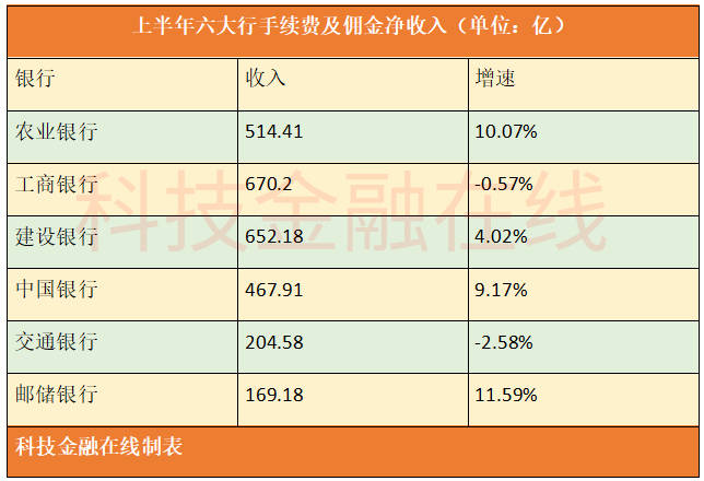 上半年,农业银行手续费及佣金净收入为514.41亿,同比增长了10.07%,而工商银行手续费及佣金净收入为670.2亿,下降了0.57%。