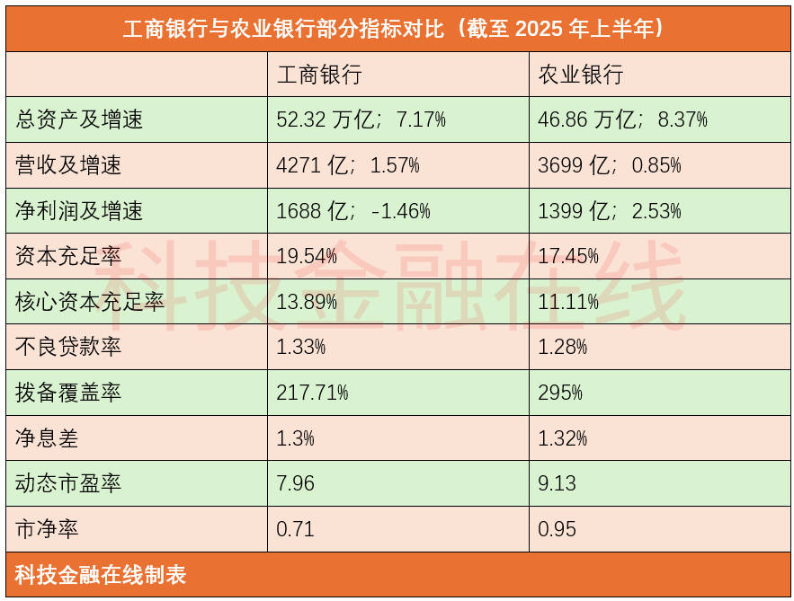 截至2025年中报,农业银行的资本充足率为17.45%、核心资本充足率为11.11%,工商银行的资本充足率为19.54%、核心资本充足率为13.89%。