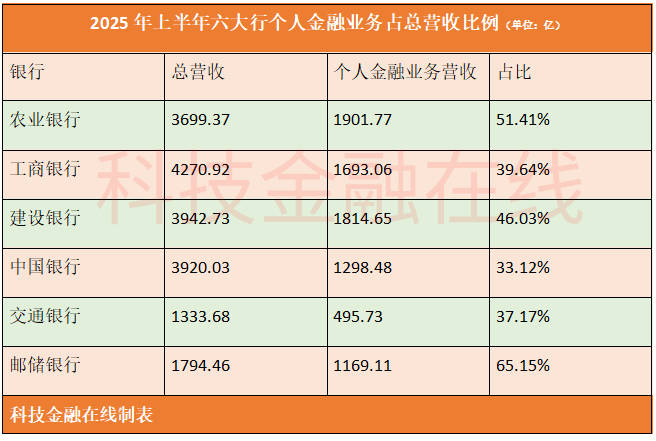 在国有六大行中,剔除向来个人业务占大头的邮储银行,农业银行是唯一一家个人金融业务收入占比超过50%的银行。