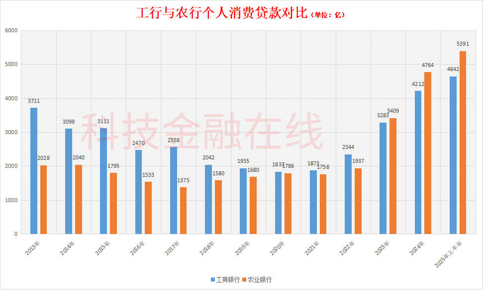 2023年,农行的个人消费贷款余额就超过了工商银行,当年农行这一数据为3409亿,工行为3283亿,到今年上半年,农行达到了5391亿,超过工行700多亿。