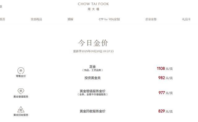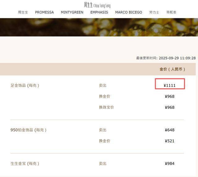 国内金饰价格方面,据品牌官网消息,周生生足金饰品价格报1111元/克,较9月26日上涨5元/克。周大福、六福珠宝等品牌足金首饰价格则维持在1108元/克不变。