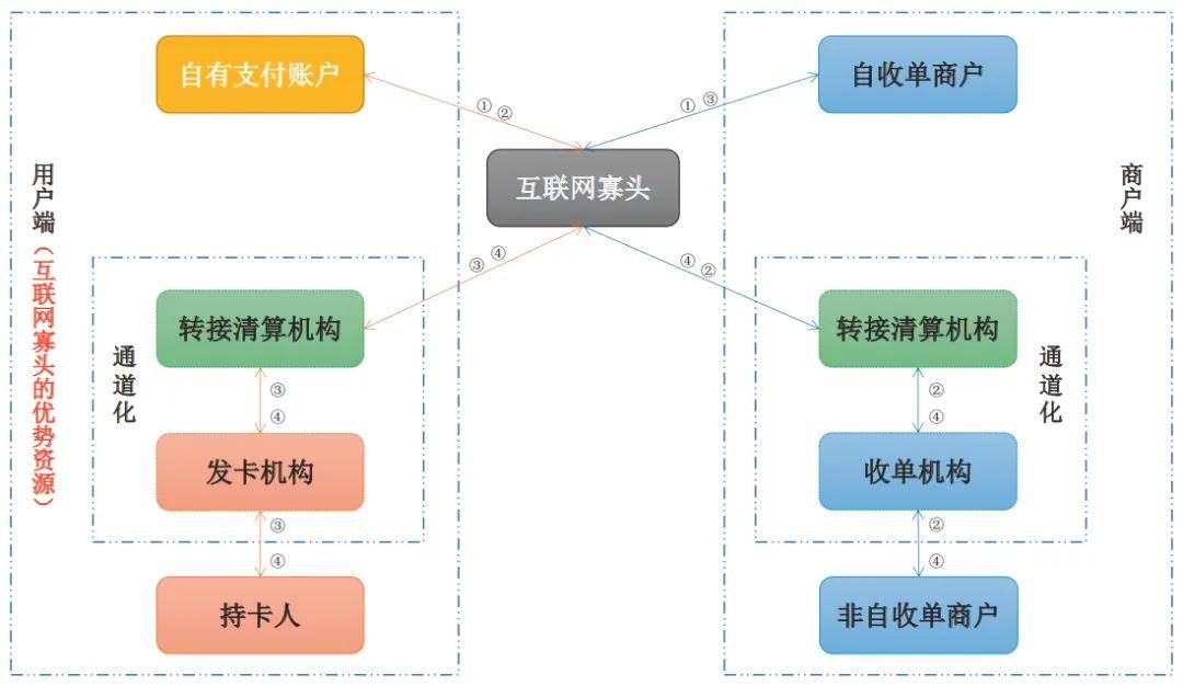 互联网寡头依托自身钱包方的强大用户资源建立自主品牌,并将业务角色延伸至账户服务方、收单机构和转接清算机构,同时将市场上原有的收单机构、发卡机构甚至转接清算机构吸收至其生态体系内,从而不断渗透和控制各业务领域,通过控制市场倒逼监管。