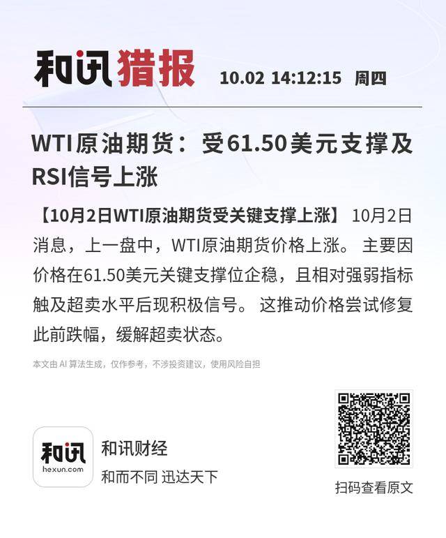 【10月2日WTI原油期货受关键支撑上涨】10月2日消息,上一盘中,WTI原油期货价格上涨。主要因价格在61.50美元关键支撑位企稳,且相对强弱指标触及超卖水平后现积极信号。这推动价格尝试修复此前跌幅,缓解超卖状态。
