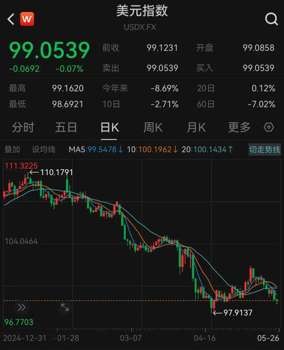 美元指数继续走弱,截至5月26日19:45,美元指数最新报99.0539,跌0.07%。