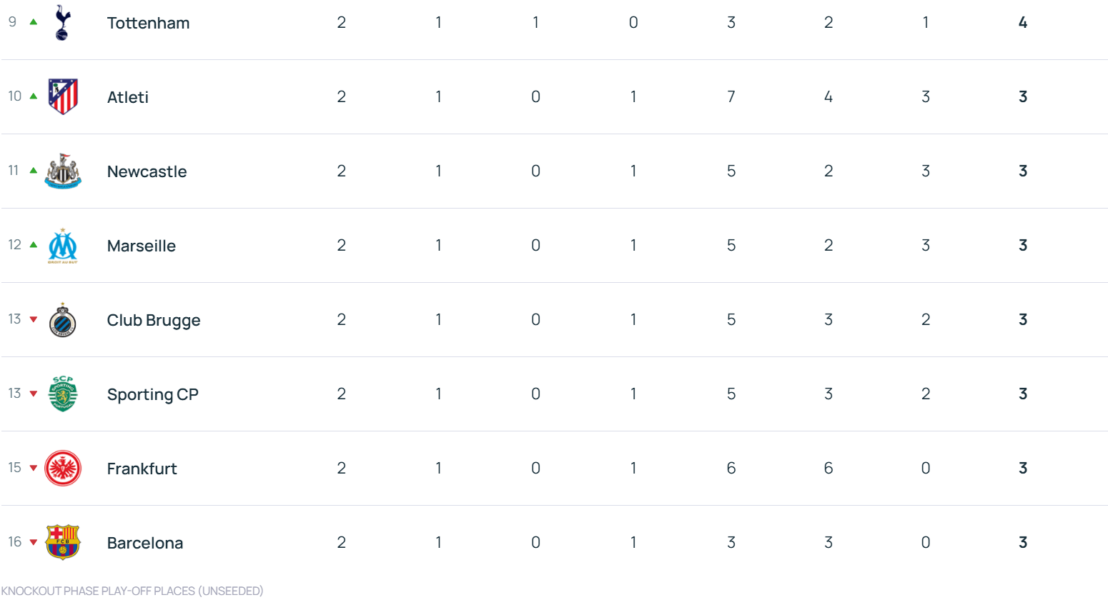 欧冠联赛积分榜目前的前八(直接晋级欧冠16强):