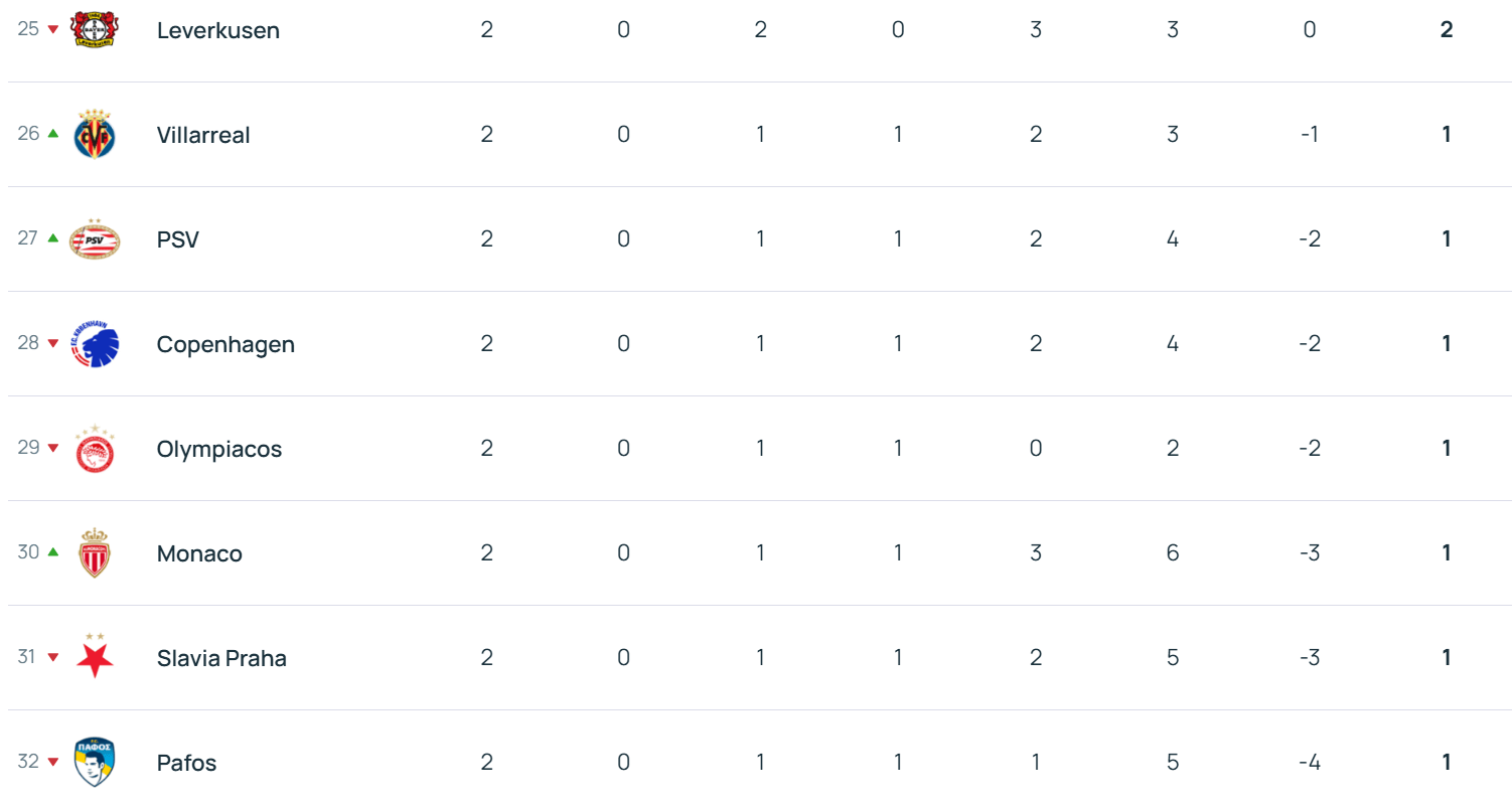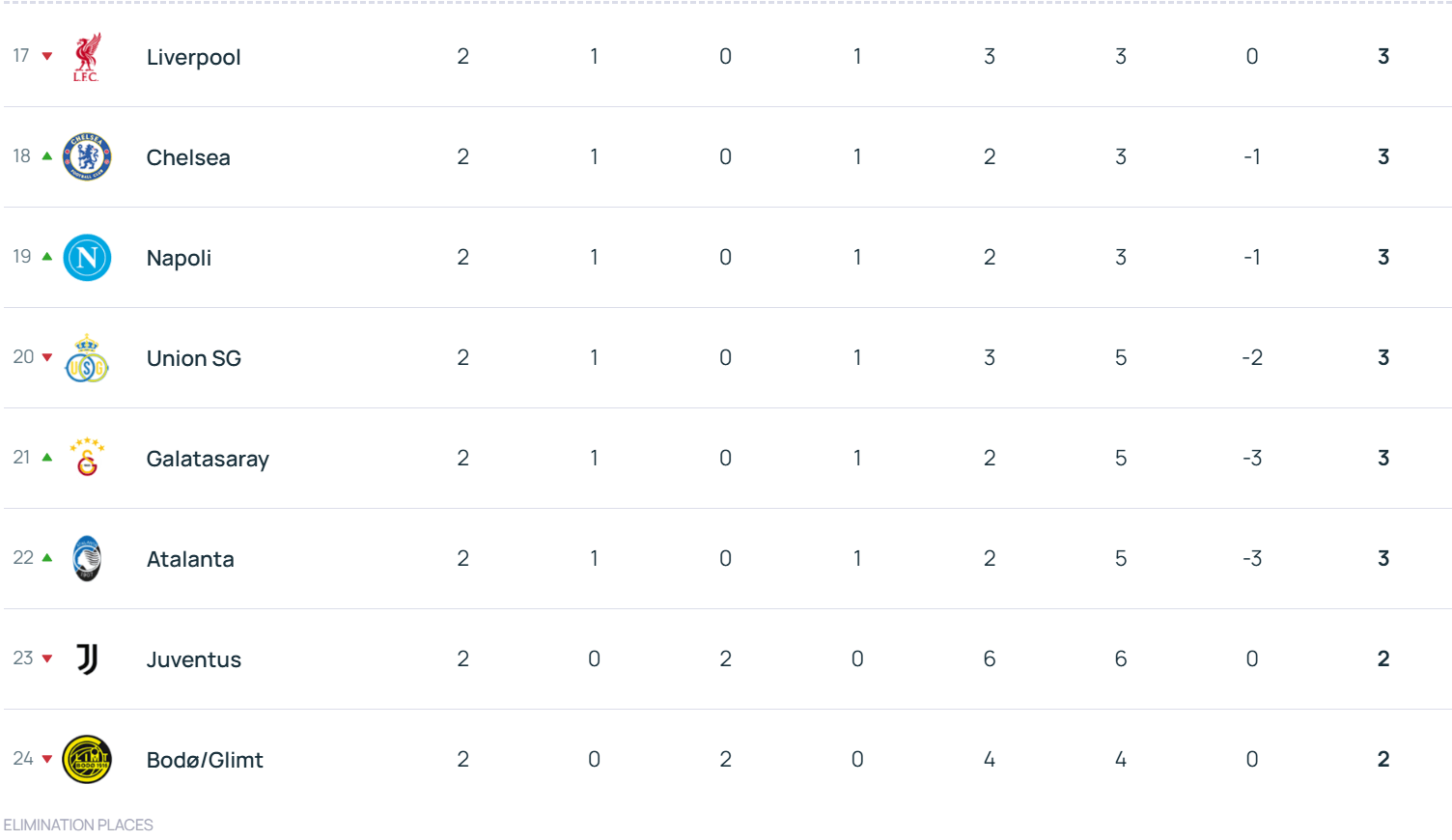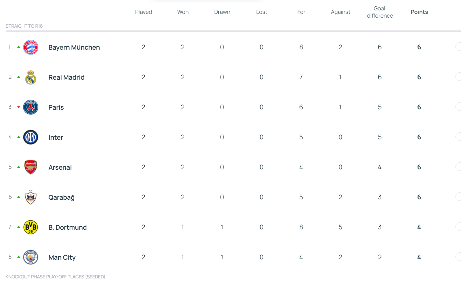 目前,拜仁、皇马、巴黎、阿森纳、国米和阿塞拜疆球队卡拉巴赫取得两连胜积6分。利物浦在0-1输给加拉塔萨雷之后跌至积分榜第17位,切尔西排在第18位。