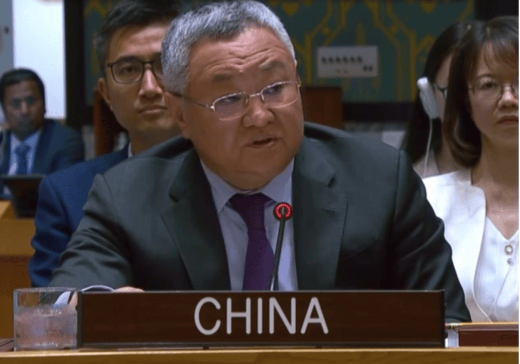 中国常驻联合国代表傅聪9月30日在安理会表决镇压海地黑帮部队决议草案后作解释性发言,对该部队的运作和前景表示担忧 图:新华社视频截屏