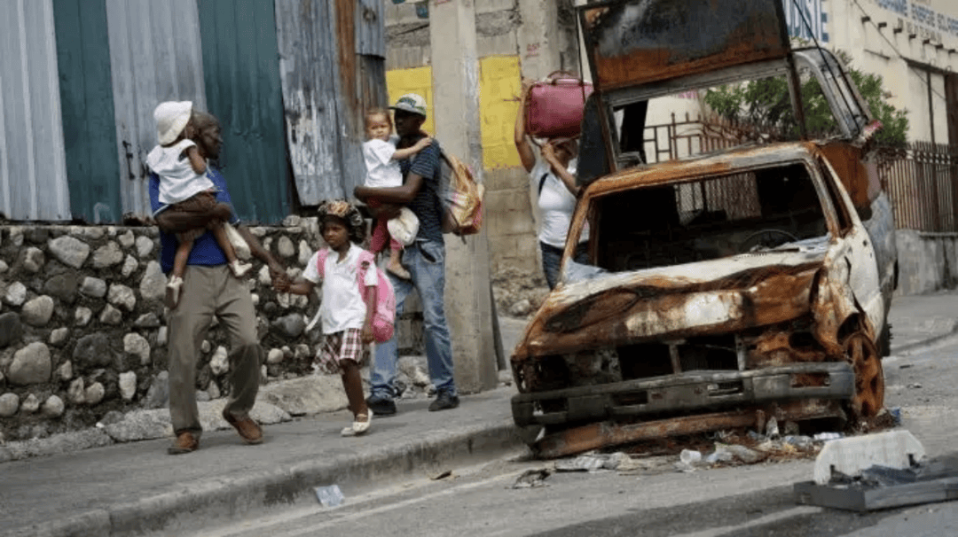 2024年5月2日,海地太子港,正进行的犯罪暴力之中居民在一次袭击后撤离德尔马斯22社区之际走过一辆被烧毁的车