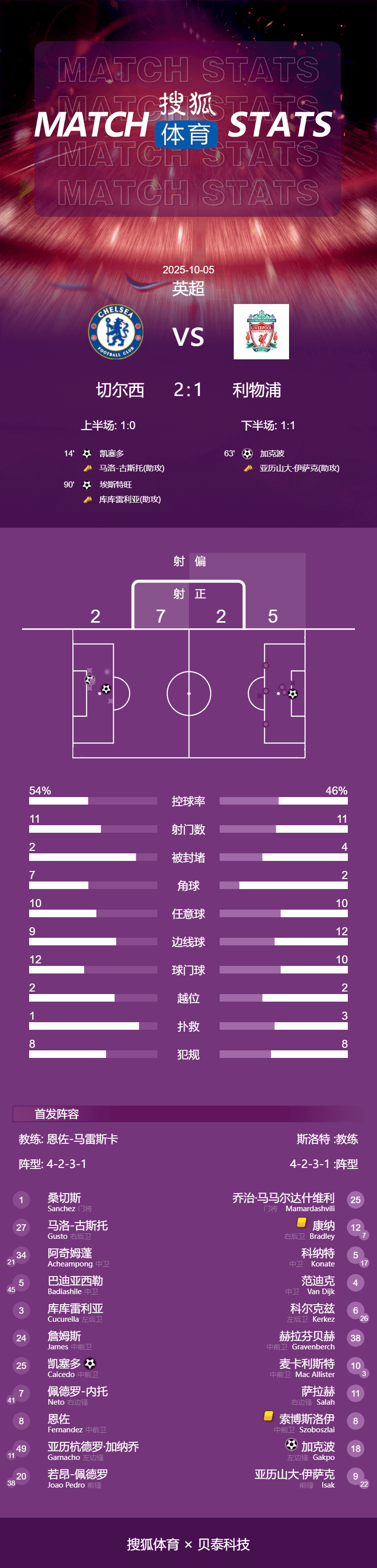 切尔西(4-2-3-1):1-桑切斯/24-詹姆斯、34-阿奇姆彭(68’21-哈托)、5-巴迪亚西勒(55’45-拉维亚)、3-库库雷利亚/27-古斯托、25-凯塞多/8-恩佐、7-内托(75’41-埃斯特旺)、49-加纳乔(75’11-吉滕斯)/20-佩德罗(75’38-吉乌)