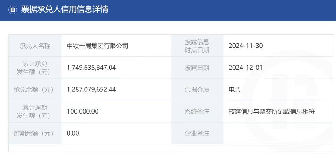 3、查询票据信息披露。通过票据信息披露平台的数据显示,承兑余额反映了承兑人未结清的票据总额,逾期余额为零,表明中铁十局的商票兑付能力较强,可放心签收。