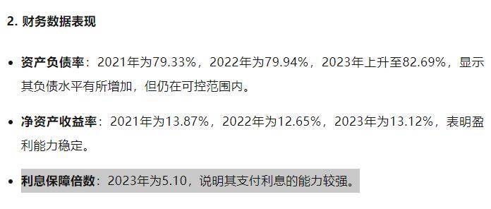 2、查询财务数据表现。通过查询近3年的资产负债率,虽然显示其负债水平有所增加,但仍在可控范围内;查询近3年净资产收益率,表明盈利能力稳定。查询利息保障倍数,说明其支付利息的能力较强。