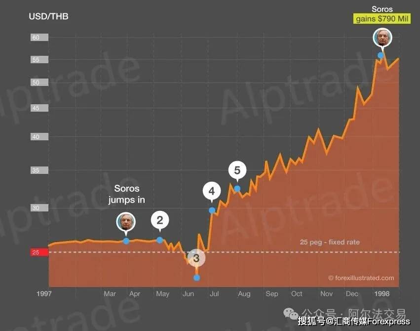 索罗斯第二笔最“臭名昭著”的交易发生在1997年,当时他看到泰铢可能贬值,于是通过远期合约做空泰铢(即做多USD/THB)。