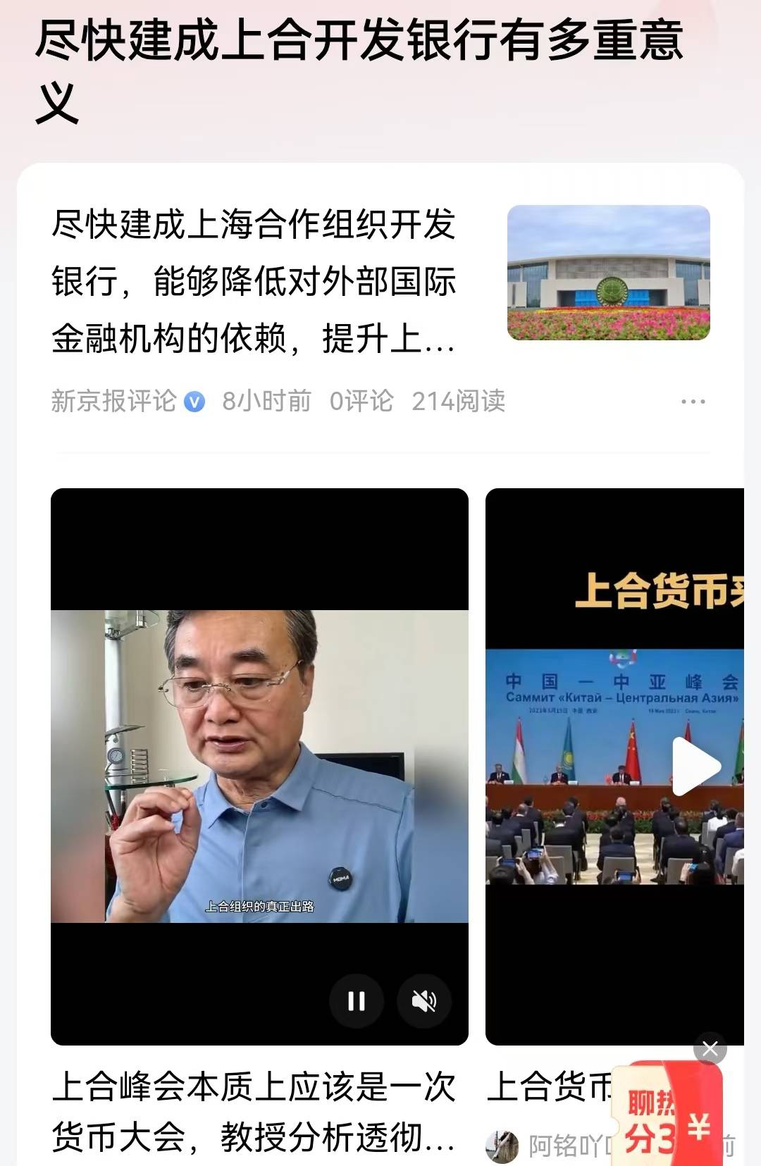 上合组织虽然成立了,但是由于种种原因,我们提倡导的上合开发银行迟迟没有成立,现在看来,对于区域经贸合作以及扩大贸易往来,因为没有银行出现了很大的障碍。现在提议尽快设立,这样可以为各国间的能源、交通、通信等跨境基础设施项目提供金融支持,直接推动区域内贸易和投资便利化,加速成员国间的经济一体化进程。
