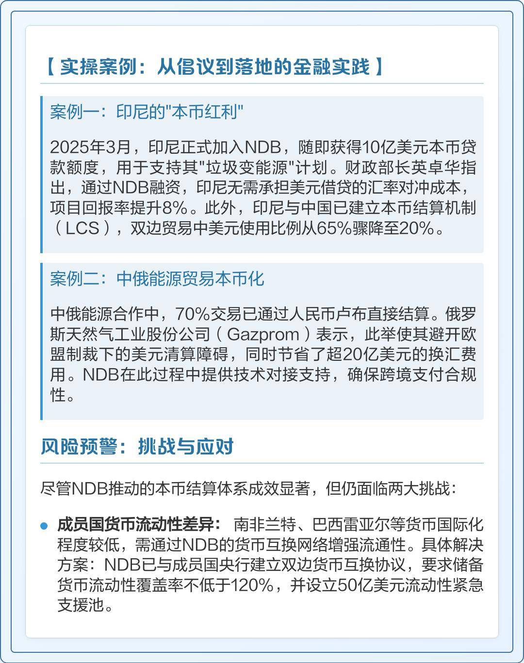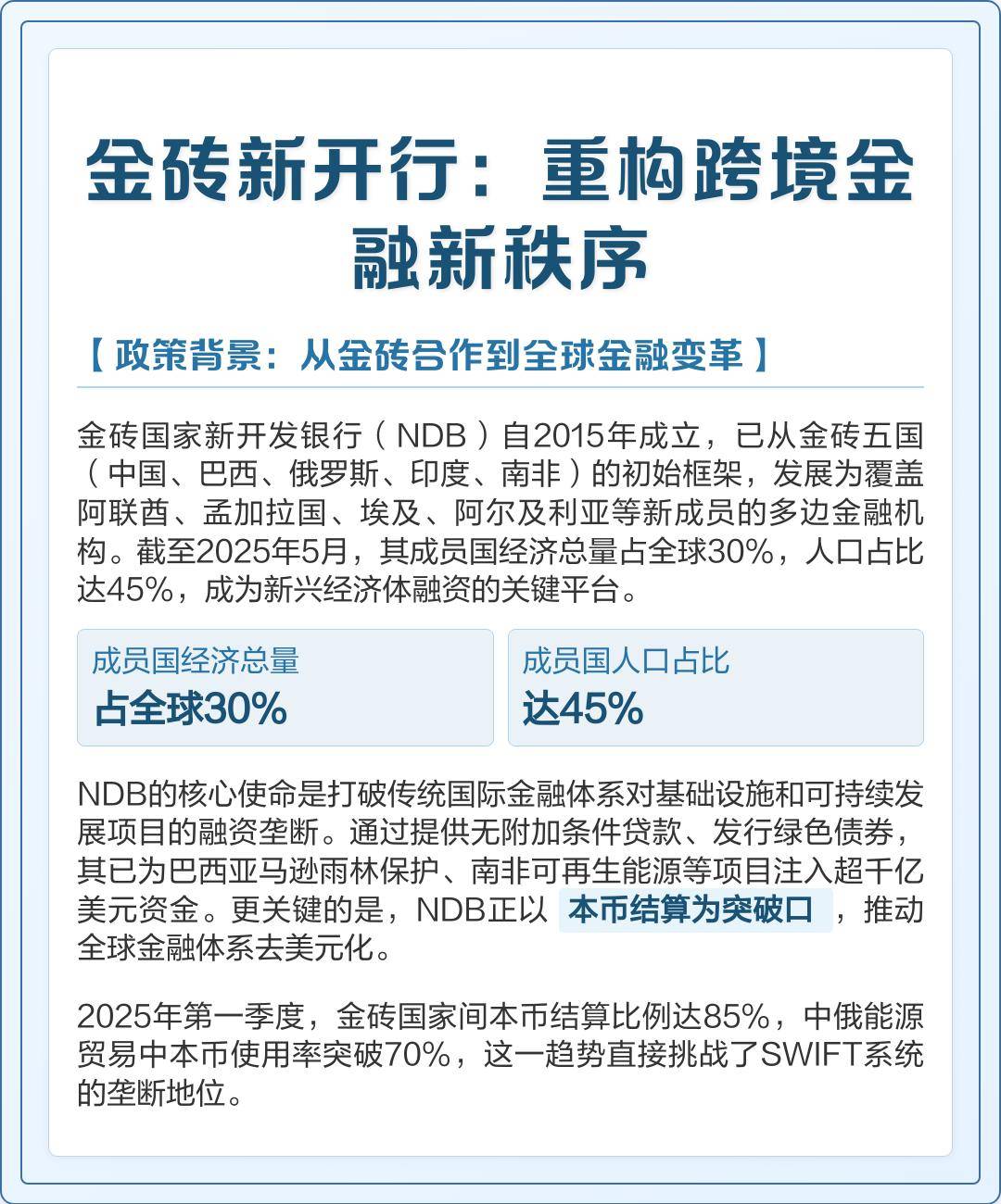 同时新开行依托《跨境人民币政策通知》建立了"本币结算+关税对冲"机制,帮助组织内部各国企业规避美元清算成本及关税风险。总部设立在上海的金砖新开发银行,就是要让金砖国家组织内部联系越来越紧密,加入的国家越来越多,完全可以摆脱以美元霸权为主的国际贸易结算体系。